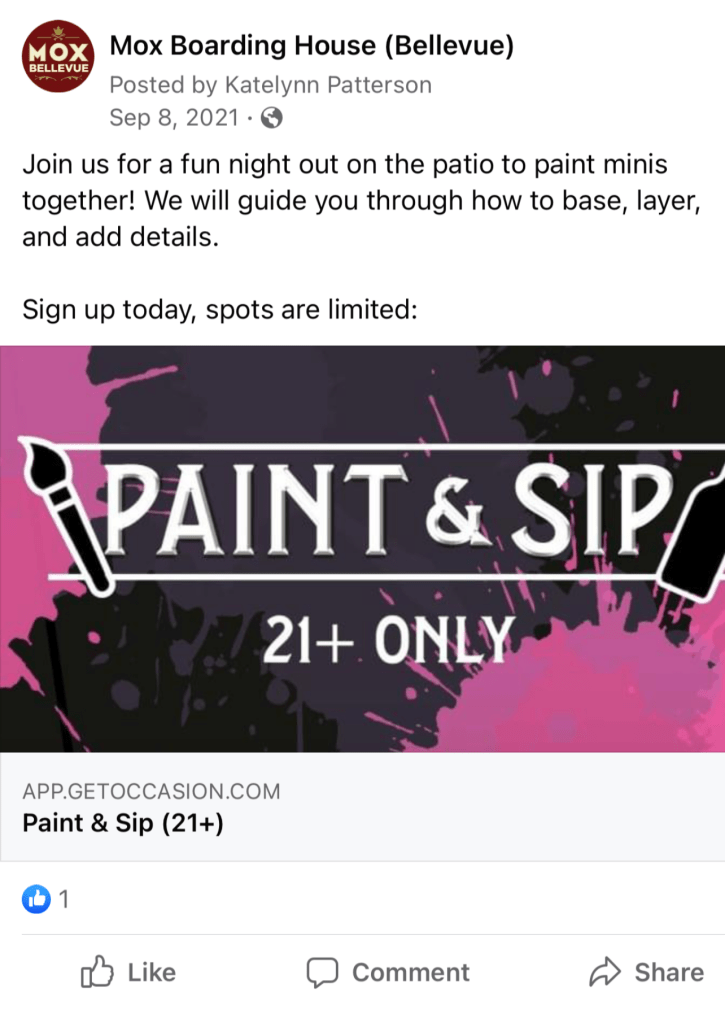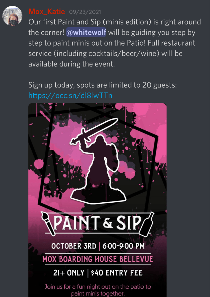 Putting on unique and interesting experiences helps us build community. We’ve noticed that most of our customers start their journey with us during an event, then come back time and time again. Paint & Sip is an event we put together to bring in new people to the hobby of painting miniatures in a fun and relaxing environment.